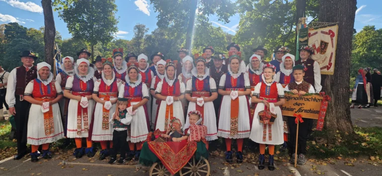 Beim traditionellen Trachten- und Schützenumzug zum 190. Oktoberfest in München war auch die Gemeinschaft Wischauer Sprachinsel e.V. wieder mit dabei. Rund 9.000 Trachtenträger zogen bei strahlendem Sonnenschein durch die Münchner Innenstadt und begeisterten das Publikum mit farbenprächtigen Trachten, Fahnen und Musik. Nach dem Umzug stärkten sich die Teilnehmer im Festzelt und genossen das besondere Wiesn-Flair.