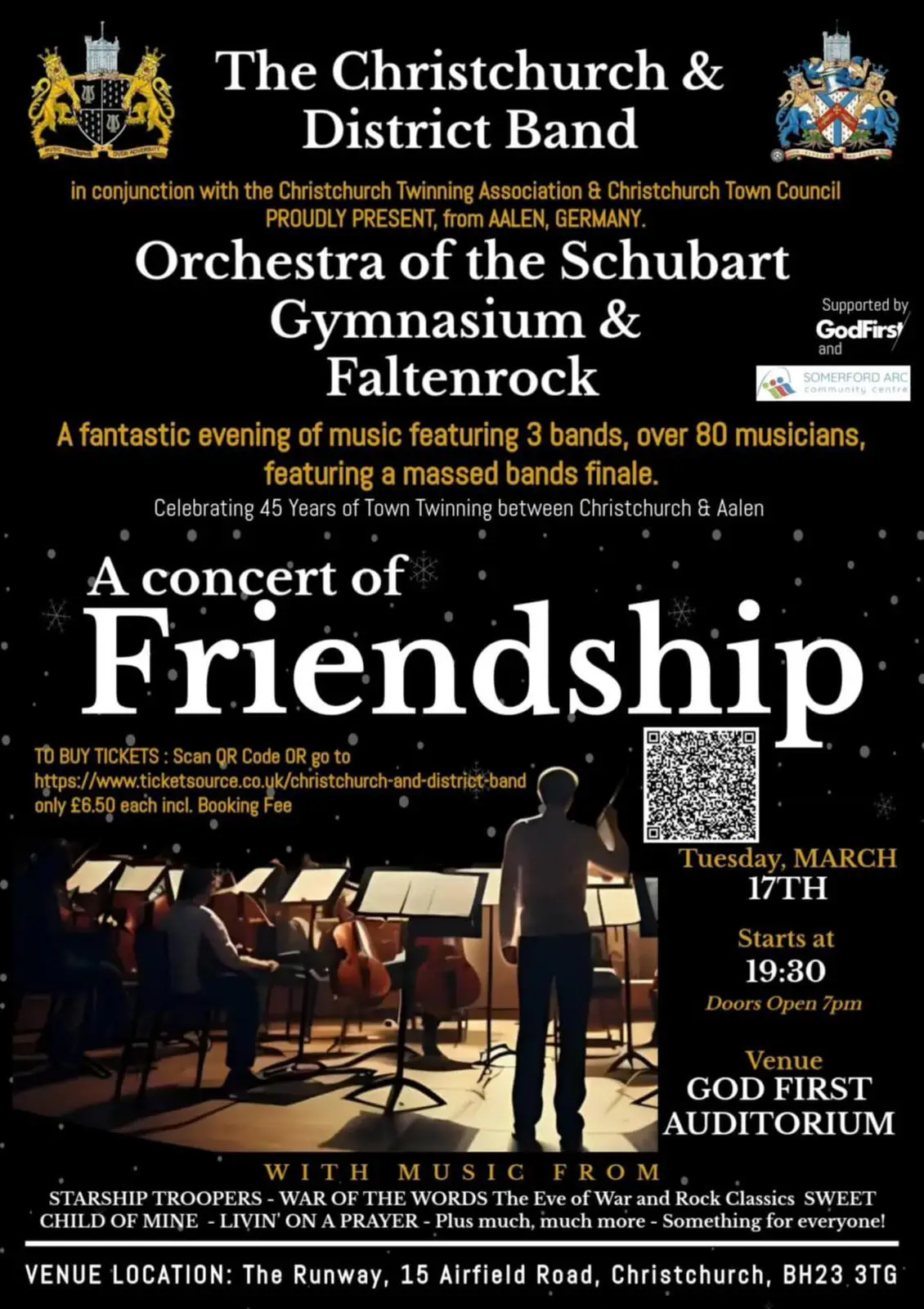 Im Rahmen des Jubiläums der Städtepartnerschaft zwischen Aalen und Christchurch findet am 17. März ein besonderes Konzert in Christchurch statt. Das Orchester des Schubart-Gymnasiums Aalen und die Band „Faltenrock“ treten gemeinsam mit der Christchurch & District Band auf. Unter dem Titel „A Concert of Friendship“ erwartet die Besucher ein musikalischer Abend mit über 80 Musikerinnen und Musikern.