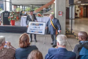Er dankte allen, die in den vergangenen 40 Jahren die Freundschaft zwischen den zwei Städten gefördert und sich für die Städtepartnerschaft eingesetzt haben, allen voran nannte er Oberbürgermeister a. D. Ulrich Pfeifle. Einen besonderen Dank richtete er an seinen belgischen Amtskollegen Daniel Olivier, der sich seit vielen Jahren sehr für die Partnerschaft eingesetzt habe: “Wenn diese Partnerschaft Eltern hätte, wärst Du der Papa“.
