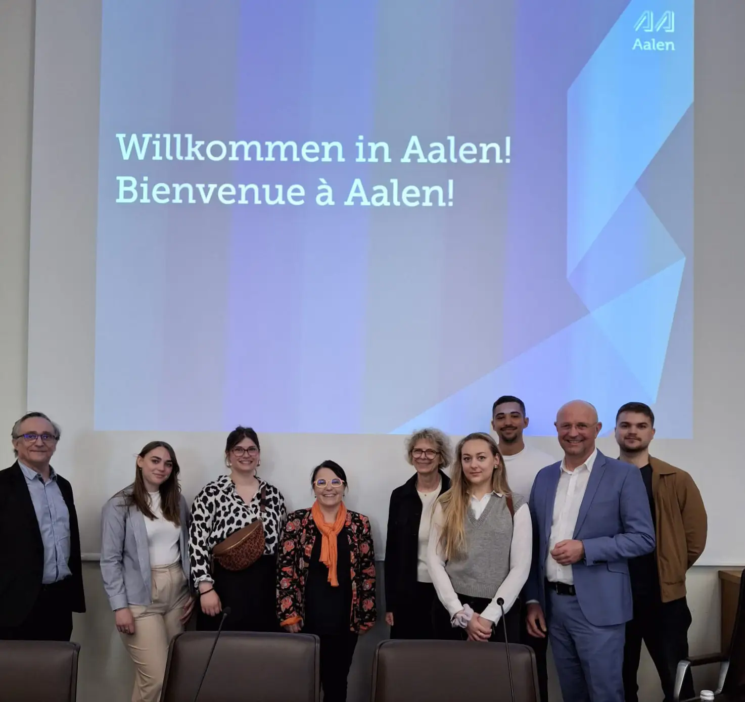 In Kooperation mit der Hochschule Aalen, konnte vom 12 bis 17. April 2025 eine Gruppe von fünf Studierenden der „groupe FIM“, einer Art Dualer Hochschule in unserer französischen Partnerstadt Saint-Lô, zusammen mit ihren zwei Begleitpersonen Kontakte zu Aalener Firmen und zu deutschen Kommilitonen knüpfen. Die Stadt Aalen, vertreten durch Herrn Bürgermeister Schwarzendorfer, empfing die Gruppe zusammen mit der Handballmannschaft aus Saint-Lô, die zur selben Zeit zu Besuch bei ihren Freunden in Hofen war und die eine langjährige und sehr enge Freundschaft verbindet. Herr Schwarzendorfer betonte die Bedeutung solcher Begegnungen für ein friedliches Europa, verbunden mit dem Wunsch, dass die sportlichen Verbindungen weiterhin bestehen bleiben und die neu geknüpften eine Fortsetzung finden. An den Empfang im großen Sitzungssaal schloss sich ein Besuch der Dachterrasse des Rathauses an, bei dem sowohl die französischen Gäste als auch die deutschen Begleiter bei sonnigem Wetter die Aussicht auf die Stadt und die Umgebung genießen konnten.