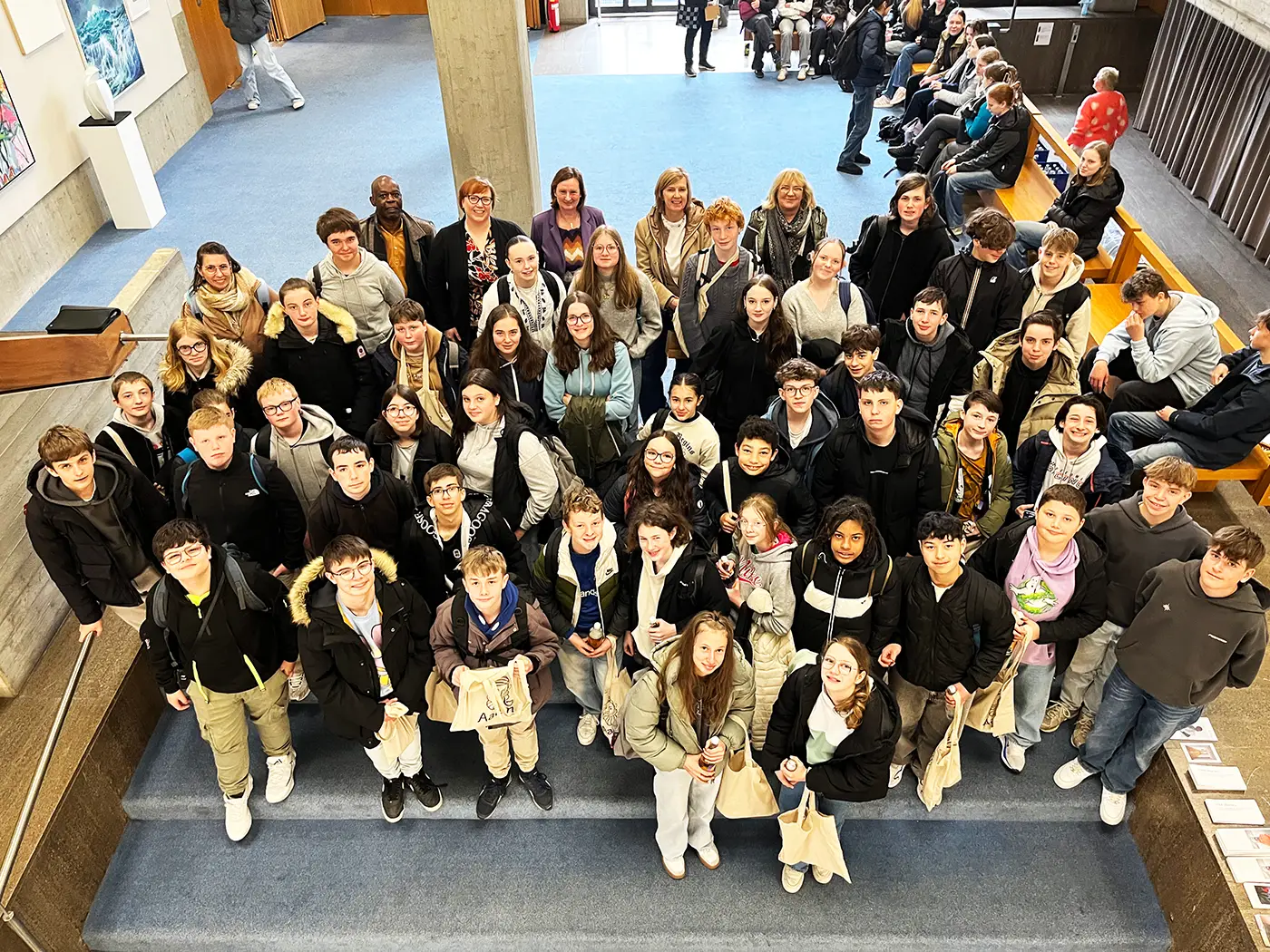 Die Jugendlichen zwischen 14 und 15 Jahren kamen vom Collège Lavalley in Saint-Lô und dem Collège Jean Follain in Canisy bei Saint-Lô zum Schüleraustausch mit den 8. und 9. Klassenstufen ihrer Partnerschulen, dem Schubart-Gymnasium und dem Kopernikus-Gymnasium Wasseralfingen. Dies war der Rückbesuch nach der Reise der deutschen Schüler:innen im September 2024. Die beiden Aalener Schulen kooperieren seit letztem Jahr erfolgreich beim Frankreich-Austausch mit der Normandie. Begleitet wurden die Reisen am SG von den Lehrerinnen Silvia Glimschi und Konstanze Forner und am KGW von Saskia Daiß und Felix Reil. Stadtkämmerin Daniela Faußner, die vor einigen Jahren im Rahmen eines Praktikums selbst in Saint-Lô lebte, begrüßte die Gruppe im Großen Sitzungssaal des Rathauses und erzählte von Ihren damaligen Erfahrungen, die sie interkulturell so positiv und nachhaltig geprägt haben.