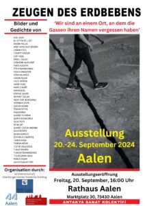 Am Freitag, 20. September fand um 16 Uhr die bewegende Eröffnung der Wanderausstellung „Zeugen des Erdbebens“ des „Antakya Art Collective“ durch Oberbürgermeister Frederick Brütting in der Galerie im Rathaus Aalen statt.